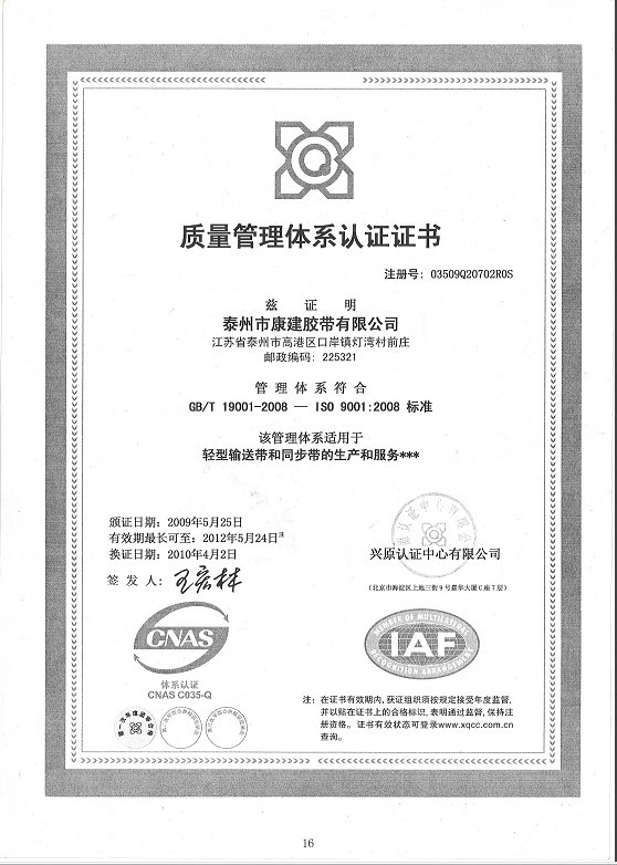 泰州市康建膠帶有限公司經(jīng)過十多年的發(fā)展已經(jīng)成為一家從事輸送帶和傳動(dòng)帶類及相關(guān)設(shè)備生產(chǎn)和銷售的公司。位于中國(guó)經(jīng)濟(jì)發(fā)達(dá)的長(zhǎng)三角經(jīng)濟(jì)圈江蘇省泰州市高港區(qū),交通發(fā)達(dá)。我司以“合格的產(chǎn)品,滿意的服務(wù)”為宗旨,發(fā)揚(yáng)團(tuán)結(jié)、開拓、拼搏爭(zhēng)先的創(chuàng)業(yè)精神,“康建”在全國(guó)行業(yè)樹立了良好的企業(yè)形象。“康建”產(chǎn)品已通過ISO9001國(guó)際質(zhì)量體系認(rèn)證,從原料﹑工藝等方面進(jìn)行了嚴(yán)格的控制,從而確保了產(chǎn)品質(zhì)量的穩(wěn)定可靠,成為各......
